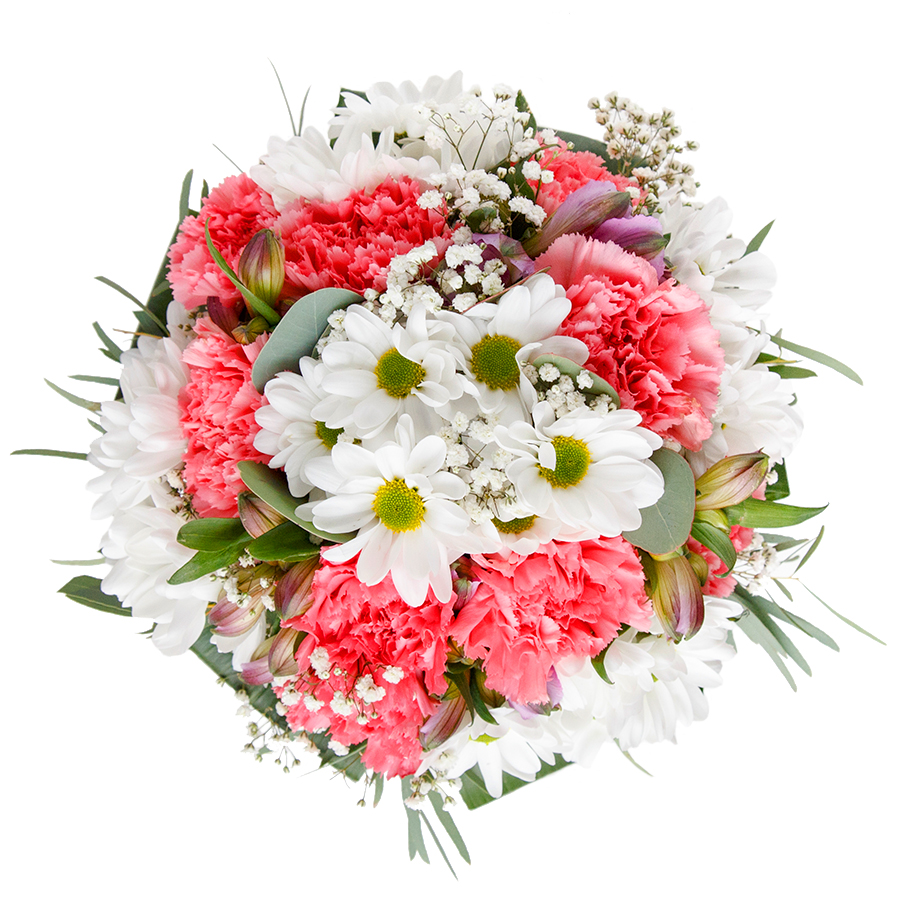 Send a touch of elegance with this gorgeous bouquet composed of crisp white chrysanthemums, delicate gypsophila, enchanting light pink carnations, and rich aspidistra leaves. Each flower is carefully hand-selected to ensure peak freshness and stunning appearance.